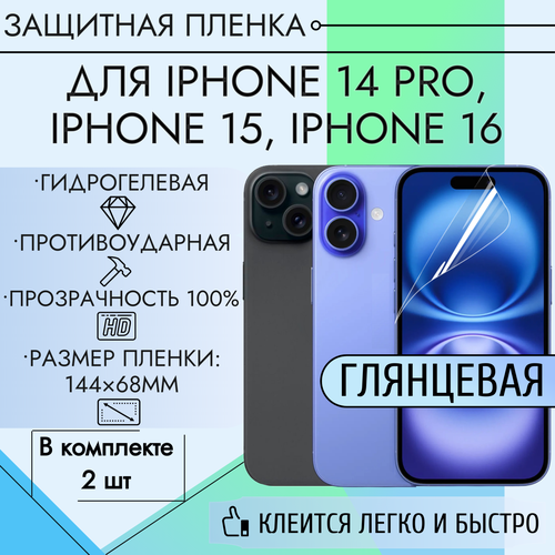 Гидрогелевая полиуретановая пленка на iPhone 15, iPhone 16, iPhone 14 Pro (Комплект 2шт) / защитная пленка на Айфон 15, Айфон 16, Айфон 14 Про