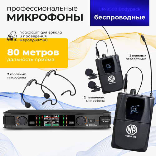Беспроводной микрофон NOIR-audio UR-9500 Bodypack для вокала, для караоке, для мероприятий c двумя головными и петличными радиомикрофонами