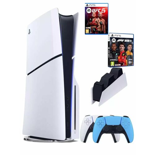 PS5 (ПС5) Игровая приставка Sony PlayStation 5 Slim + 2-й геймпад(голубой) + зарядное + игра UFC 5 + Формула 1, 1000 Gb