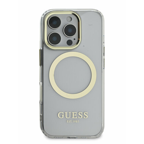 Guess для iPhone 16 Pro Max чехол PC/TPU Metal outline Hard Transparent/Gold (MagSafe)