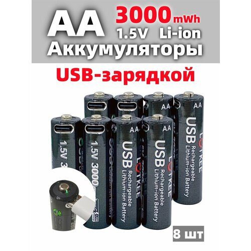 Аккумуляторные батарейки LOTKEE, Li-Ion, USB зарядка, AA, 3000mWh, 8шт