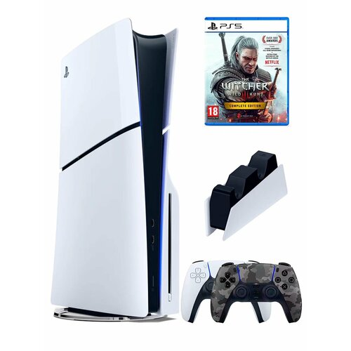 PS5 (ПС5) Игровая приставка Sony PlayStation 5 Slim disk+2-й геймпад(военный)+зарядное+Игра Witcher 3, 1000ГБ