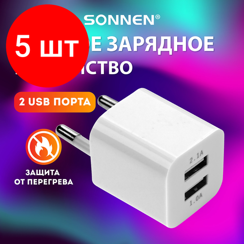 Комплект 5 шт, Зарядное устройство сетевое (220В) SONNEN, 2 порта USB, выходной ток 2.1 А, белое, 454797