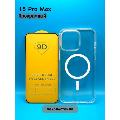 Комплект для iPhone 15 Pro Max: прозрачный чехол с MagSafe и анимацией + стекло 9D (полная защита)