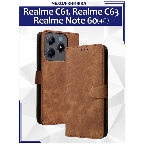 Чехол книжка для Realme C61 (4G), Realme C63 (4G), Realme Note 60 (4G) c магнитной застежкой / Реалми С61, С63, Нот 60 c отделением под карты (коричневая)