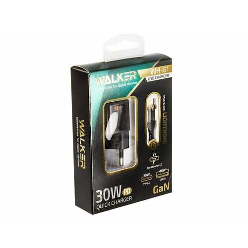 Зарядное устройство сетевое WALKER 2 слота USB+Type-C 3А 30Вт QC3.0+PD блок+ каб Apple черное WH-61