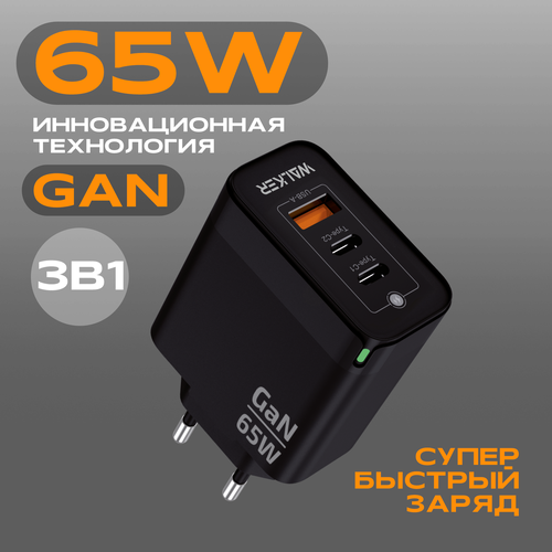 Зарядное устройство для телефона, WALKER, WH-45 GaN, 3.25А, 65Вт, USBx1/Type-Cx2, быстрая зарядка QC 3.0+PD, черное
