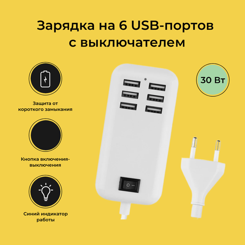 Сетевое зарядное устройство на 6 USB-портов( зарядная станция) ilepo с выключателем, 20Вт