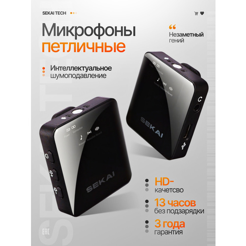 Микрофон петличка беспроводной SEKAI с шумоподавлением, 2 микрофона, подключение к устройствам iOS/Android