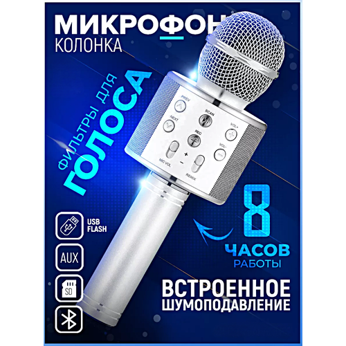 Микрофон караоке беспроводной, Микрофон WS Bluetooth со встроенной колонкой для караоке, вечеринок, Серебристый