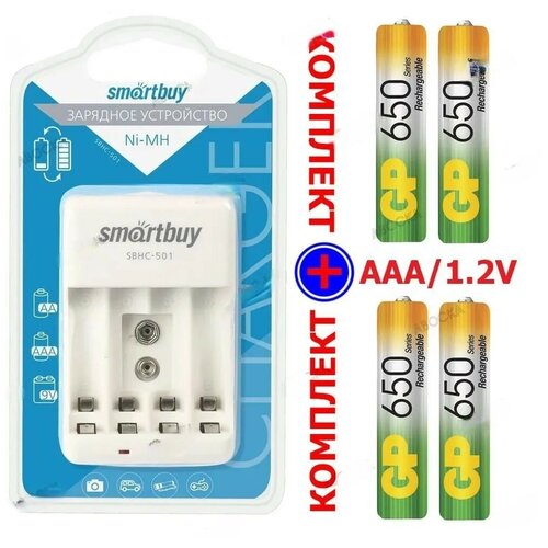 Зарядное устройство для аккумуляторных батареек + 4 аккумулятора типа ААА 650mAh/ зарядное устройство SmartBuy SВНС505