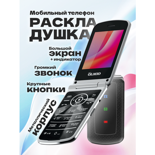 Olmio F19 — кнопочный телефон-раскладушка с крупными кнопками, SOS-кнопкой, фонариком, FM-радио и аккумулятором 800 mAh.