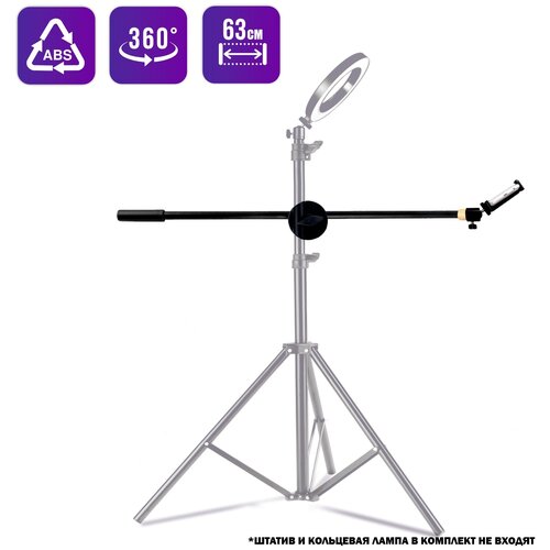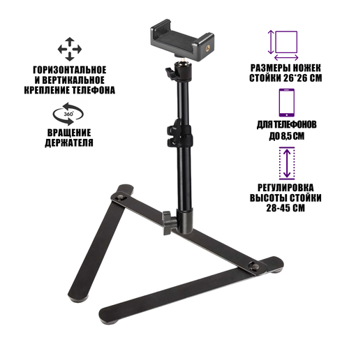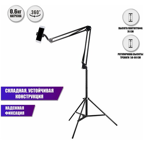 черныйУниверсальная стойка представляет собой конструкцию из усиленного штатива с высококачественной фурнитурой, на который установлена горизонтальная планка длиной 63 см с держателем для телефона на шарнирном креплении. Держатель телефона крепится как горизонтально, так и вертикально. Резьба крепления держателя и шарнира 1/4. Вы также можете регулировать длину выдвижения журавля с помощью соединительного элемента, который обеспечивает свободное вращение на 360 градусов для съемки с любого ракурса. Стойка поможет зафиксировать лампу и смартфон, чтобы освободить ваши руки. Также в комплект входит кнопка Bluetooth. Кнопка Bluetooth подключается к любому смартфону и позволяет делать фотографии, находясь на расстоянии от телефона. Напольная установка телескопическая, легко складывается, не занимает много места и помещается в чехол-сумку для переноски, которая идет в комплекте.