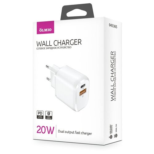 СЗУ Olmio USB, Type-C 20W, 3A, QuickCharge 3.0 белое
