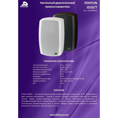 Корпусной трансляционный громкоговоритель PENTON JD 20/TW, черный, 20 Вт, с фазоинвертором.
