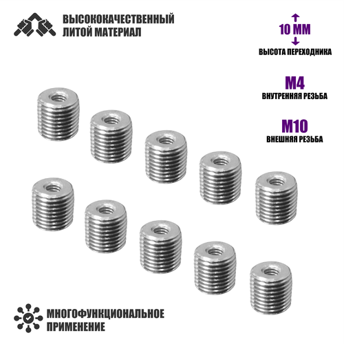 Резьбовая гайка переходник с внешней резьбой М10 и внутренней резьбой М4, высота 10 мм, 10 шт
