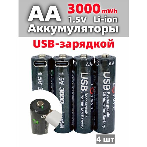 Аккумуляторные батарейки LOTKEE, Li-Ion, USB зарядка, AA, 3000mWh, 8шт