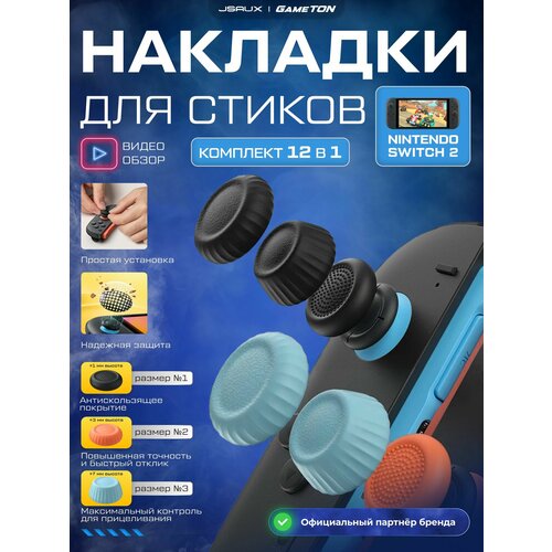 Набор накладок (12 в 1) JSAUX для стиков Nintendo Switch 2, геймпадов Pro Controller/PS5 DualSence/Microsoft Xbox (голубой-оранжевый-чёрный), 12 штук - GP0404