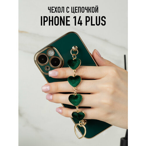 Глянцевый силиконовый чехол на iPhone 14 Plus с цепочкой из сердечек