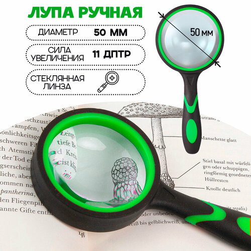 Лупа увеличительная ручная для чтения профессиональная 50 мм, цвет - черно-зелёный