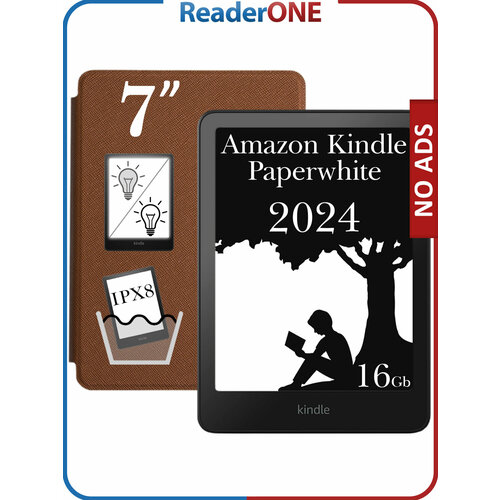 Электронная книга Amazon Kindle PaperWhite 12 2024 16Gb Black, версия без рекламы с обложкой ReaderONE PW Brown