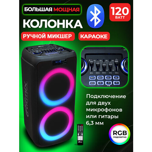 Особенности: Портативная акустическая система с Bluetooth Мощность: 120 w Динамик: 8”*2 шт Частоты: 30 Гц - 18 000 Гц Версия BT: v5.0 Аккумулятор: 3600 mAh/7,4 V Время работы: до 6 часов Воспроизведение: Bluetooth, USB, microSD, AUX Функция: TWS, FM-радио