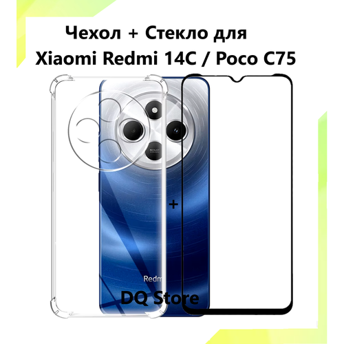 Комплект 2 в 1: Прозрачный противоударный cиликоновый чехол + защитное стекло для Xiaomi Redmi 14C / Poco C75 / Ксяоми Редми 14С / Поко С75 . Бампер с защитой камеры и усиленными углами.