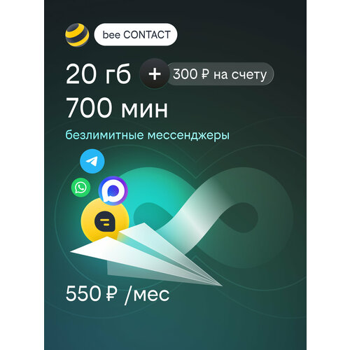 Сим-карта билайн с подпиской bee CONTACT, Республика Коми, 10 ГБ + 10 ГБ, 700 мин, баланс 300 р.