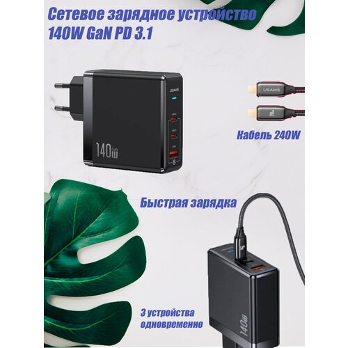 Зарядное устройство для ноутбуков, планшетов, телефонов USAMS, US-CC168,140W GaN PD 3.1, кабель 240W 2 м.