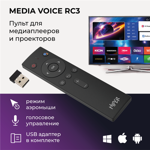 Пульт ДУ Bluetooth HIPER MEDIA VOICE RC3, голосовое управление, командные кнопки, работает во всех направлениях.
