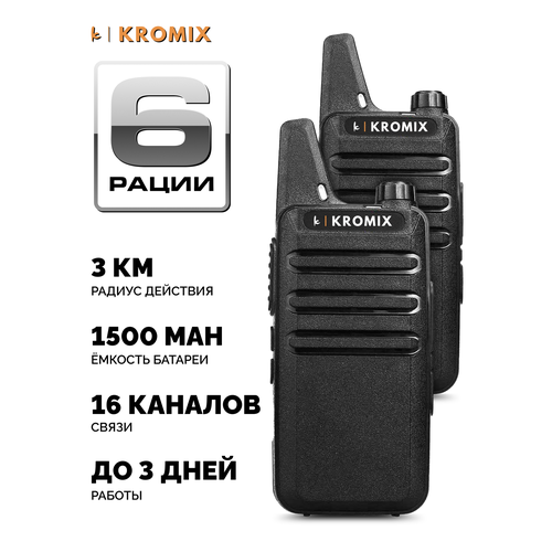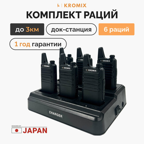 Рации KROMIX R22, комплект 6 штук, черные, с докстанцией