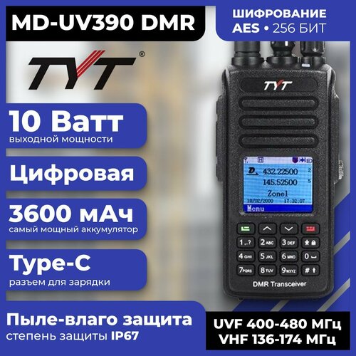 Рация TYT MD-UV390 DMR 10W, шифрование AES 256, аккумулятор 3600 TYPE-C