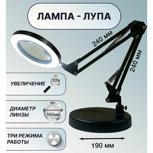 Лампа настольная с лупой 10X, на подставке, кронштейн 24x24 см, линза 105 мм, подсветка - регулировка яркости и цвета