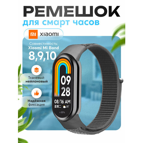 Ремешок для фитнес-браслета Xiaomi Mi Band 8/9/10,. Тканевый нейлоновый спортивный браслет для умных (смарт) часов, сменный браслет на липучке мужской и женский. черный, размер М (запястье 150–160 мм), S (запястье 135–150 мм), XL (запястье 180–200 мм), XS (запястье 120–135 мм)