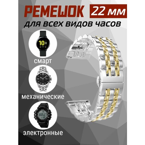 Ремешок для всех видов часов 22 мм, нержавеющая сталь, серо-золотой, универсальный