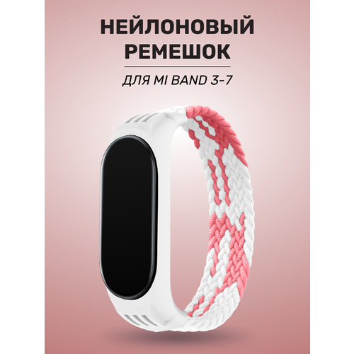 Монобраслет плетеный для Xiaomi Mi Band 3/4/5/6/7 / Тканевый нейлоновый ремешок без застежек, Бело-розовый