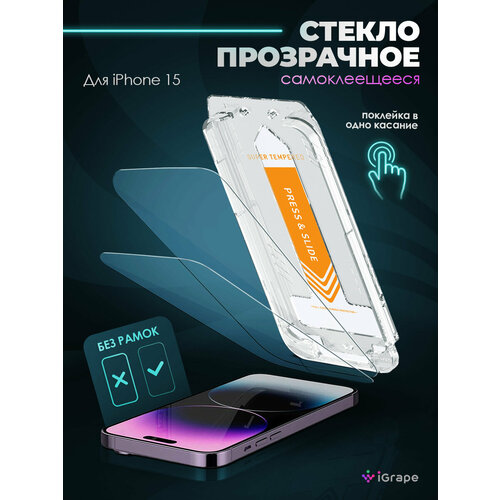 Защитное стекло самоклеящееся с боксом iPhone 15, iGrape (Прозрачное) / стекло на айфон 15