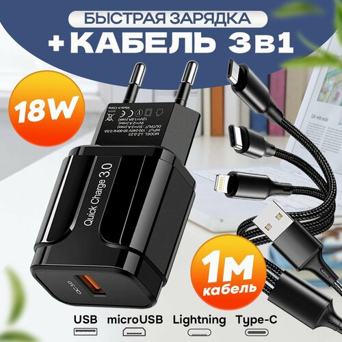 Быстрая зарядка для телефона с кабелем 1 м / Сетевой блок питания 18W/QC3.0A / Быстрое зарядное устройство для смартфона / Сетевой адаптер /