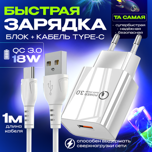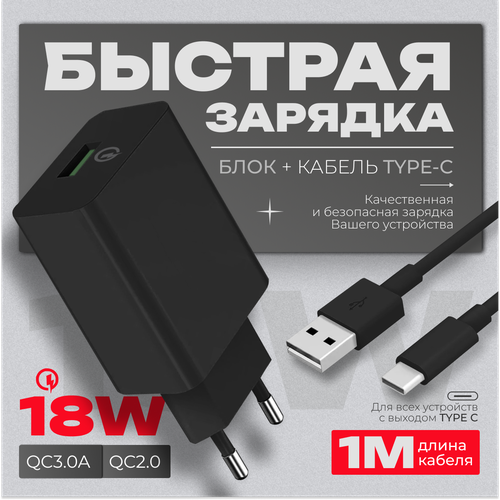 Зарядное устройство QC 3.0 18W + кабель USB Type-C 3А 1+1 для телефона / быстрая зарядка для смартфона
