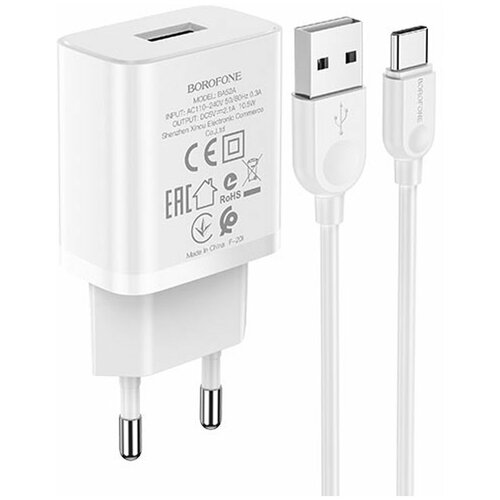 Сетевое зарядное устройство (СЗУ) Borofone BA52A (USB) + кабель Type-C, 2.1 А