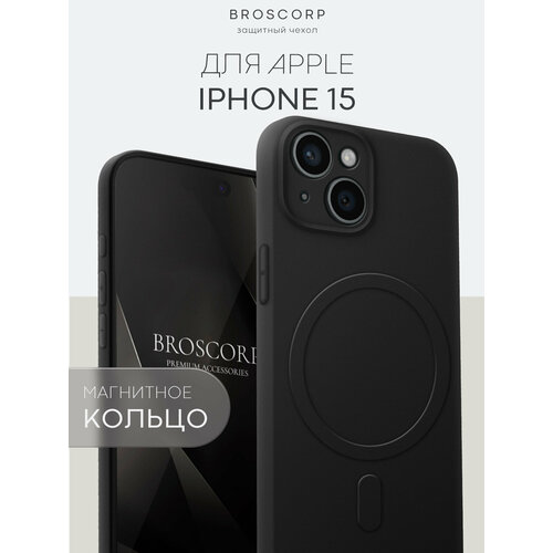Матовый силиконовый чехол Broscorp на Apple iPhone 15 (Айфон 15), тонкий, с магнитным кольцом, soft-touch, черный