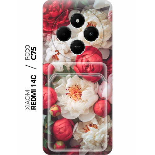Силиконовый чехол на Xiaomi Redmi 14C / Poco C75 с принтом "Красно-белые пионы" с карманом для карты