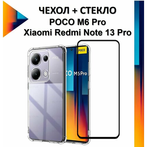 Комплект 2 в 1: Прозрачный чехол с защитой камеры и углов + полноэкранное стекло для Xiaomi Redmi Note 13 Pro / Poco M6 Pro / Сяоми Редми Ноте 13 Про