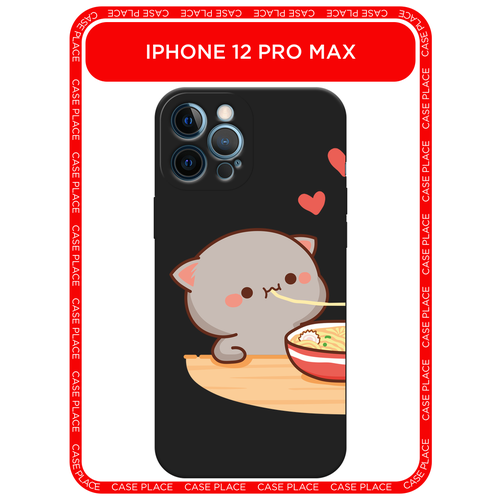 Черный матовый чехол на Apple iPhone 12 Pro Max / Айфон 12 Про Макс с принтом Чёрный котик с лапшой