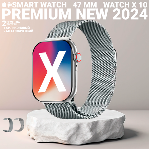 Смарт часы WATCH X10, Умные часы watch 10, premium smart watch, 47 мм с NFC, 2 ремешка, Серебристый