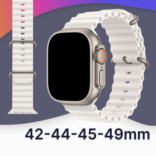 Силиконовый ремешок Ocean Band на смарт часы Apple Watch 1-9, SE, Ultra 42-44-45-49 мм / Браслет для Эпл Вотч 1, 2, 3, 4, 5, 6, 7, 8, 9, СЕ, Ультра / Белый