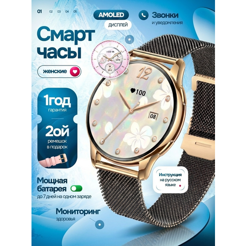 Смарт-часы наручные SMART PRESENT DA11 женские, круглые, с функцией телефона, с большим дисплеем, золотистый-черный