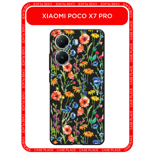 Черный матовый чехол на Poco X7 Pro / Поко X7 Про с принтом Маки и васильки фон
