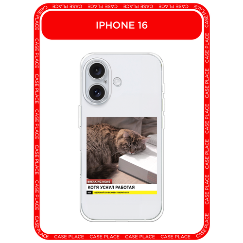 Чехол на Apple iPhone 16 / Айфон 16 с принтом Кот уснул работая, прозрачный
