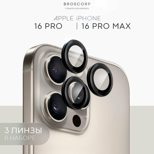 Защитные стекла на камеры Apple iPhone 16 Pro и 16 Pro Max (Айфон 16 Про и Про Макс), бренд BROSCORP, с чёрной рамкой
